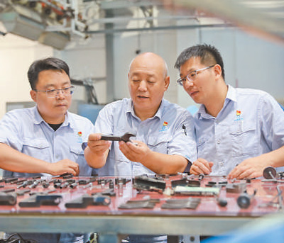 李志强(中)带领温尚志(左)和张鹏飞研究装配工具改进。牟鹏宇摄